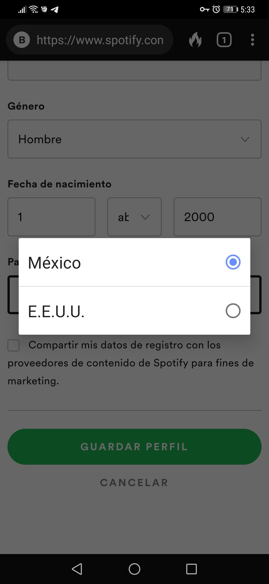 7. Entramos a Spotify con la cuenta creada y en las preferencias cambiamos a país USA y guardamos el perfil.